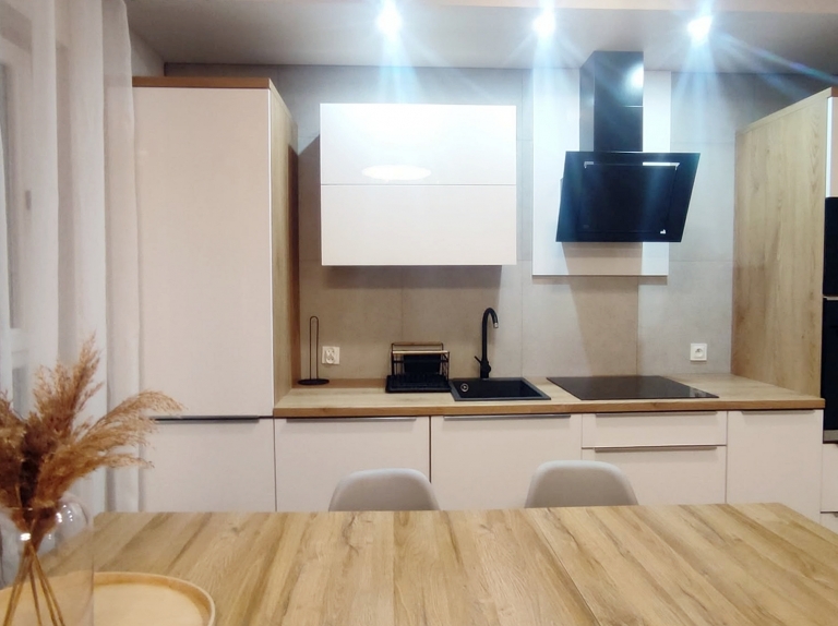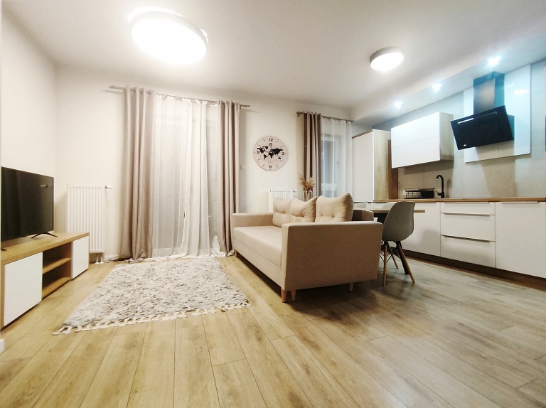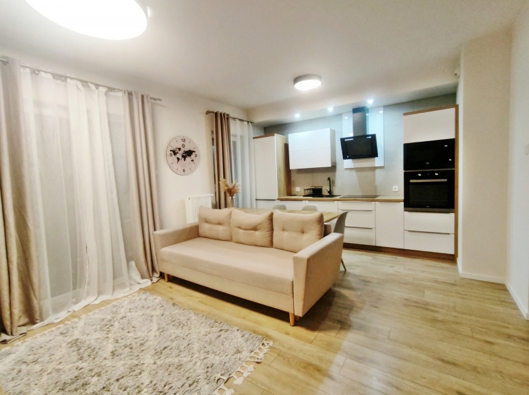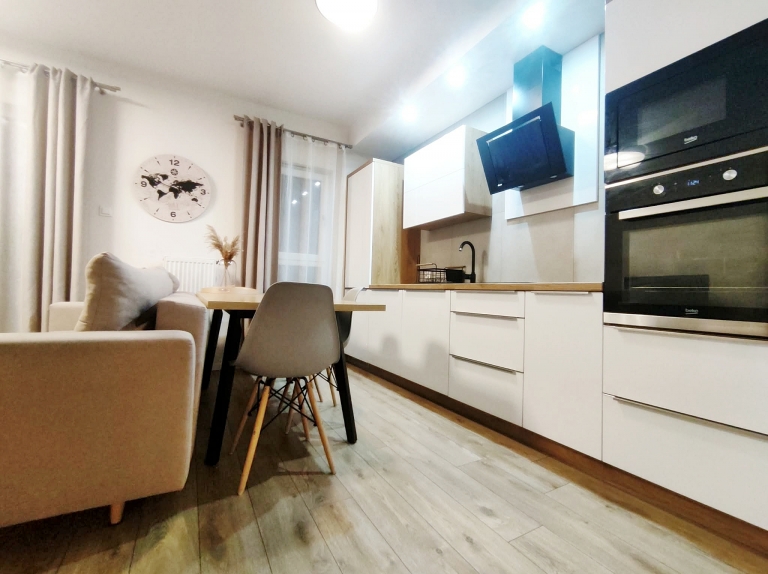 - salon z aneksem kuchennym i wyjściem na balkon – wygodna kanapa, TV, stół z krzesłami, meble kuchenne z AGD( zmywarka, piekarnik, mikrofala, lodówka)