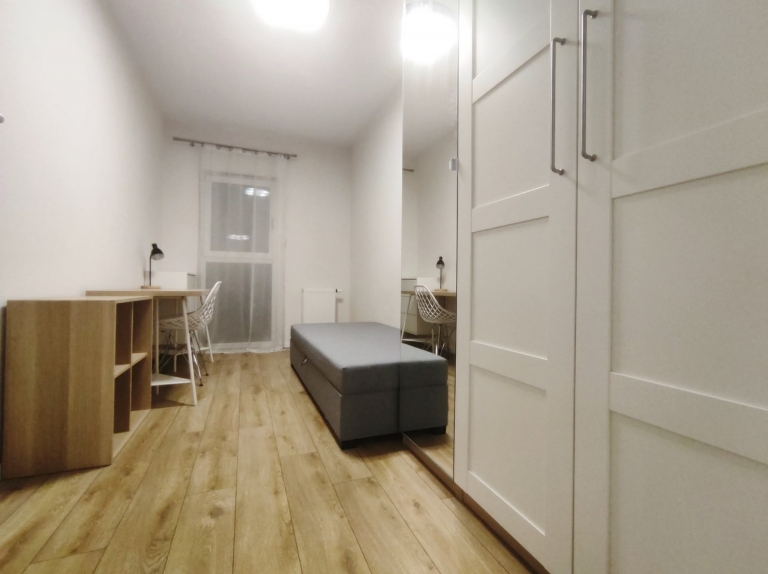 - pokój z biurkiem, szafą oraz łóżkiem jednoosobowym